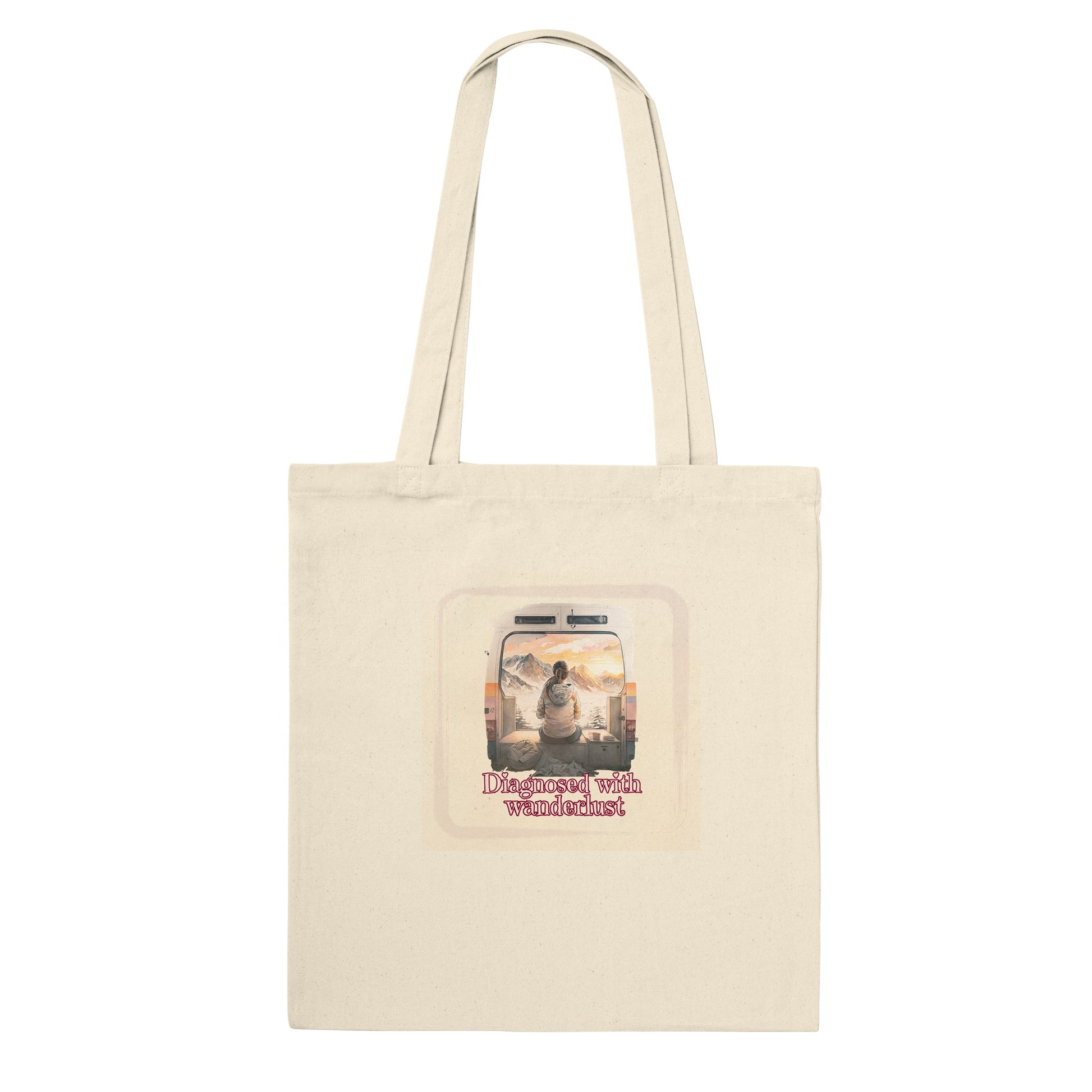 Deze stijlvolle tote-bag met de tekst 'diagnosed with wanderlust' is een must-have voor avonturiers! Met een getekend reisbusje op de tas, laat het je liefde voor reizen en ontdekking zien. De tote-bag is perfect om te gebruiken tijdens je avonturen, om je wanderlust te tonen en anderen aan te moedigen om ook de wereld te verkennen. Koop deze tote-bag en draag je passie voor avontuur met trots!