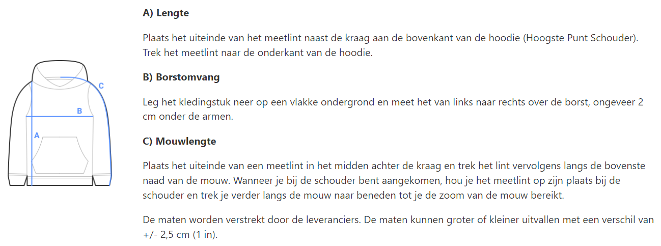 | C) Mouwlengte (cm) | 85 | 88 | 90 | 93 | 95 | 98 |
