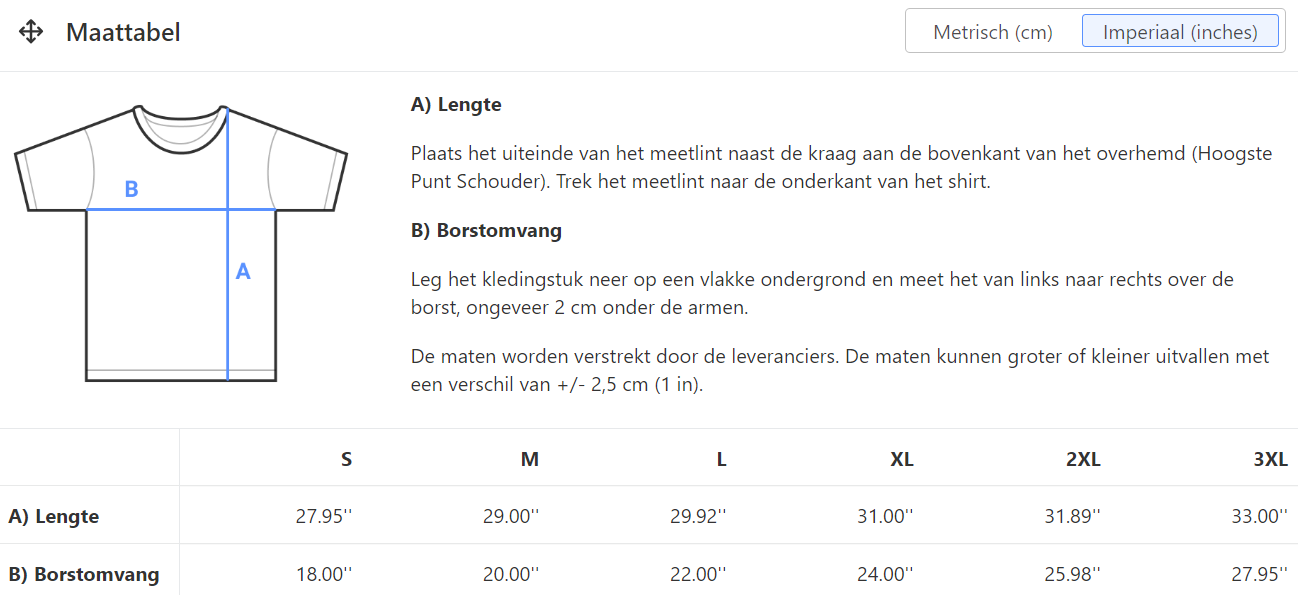 | A) Lengte (inches) | 28 | 29 | 30 | 31 | 32 | 33 |