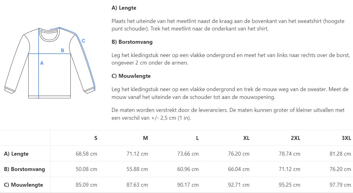 | C) Mouwlengte (cm) | 85.09 | 87.63 | 90.17 | 92.71 | 95.25 | 97.79 |