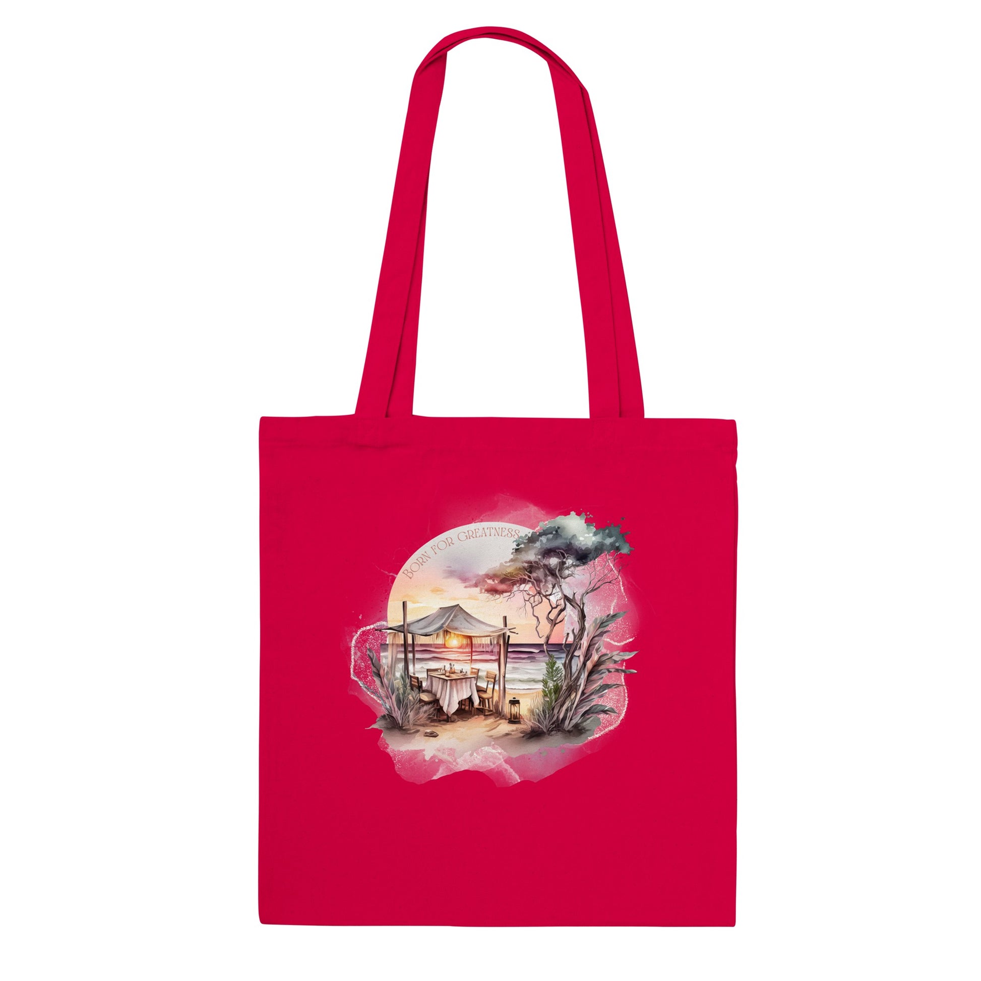 Een tote-bag met de tekst 'Born for Greatness' en het strandtafereel met de gezellige gedekte tafel is een praktische en stijlvolle accessoire. Het biedt je de mogelijkheid om je positieve mindset en vastberadenheid te tonen, waar je ook naartoe gaat.