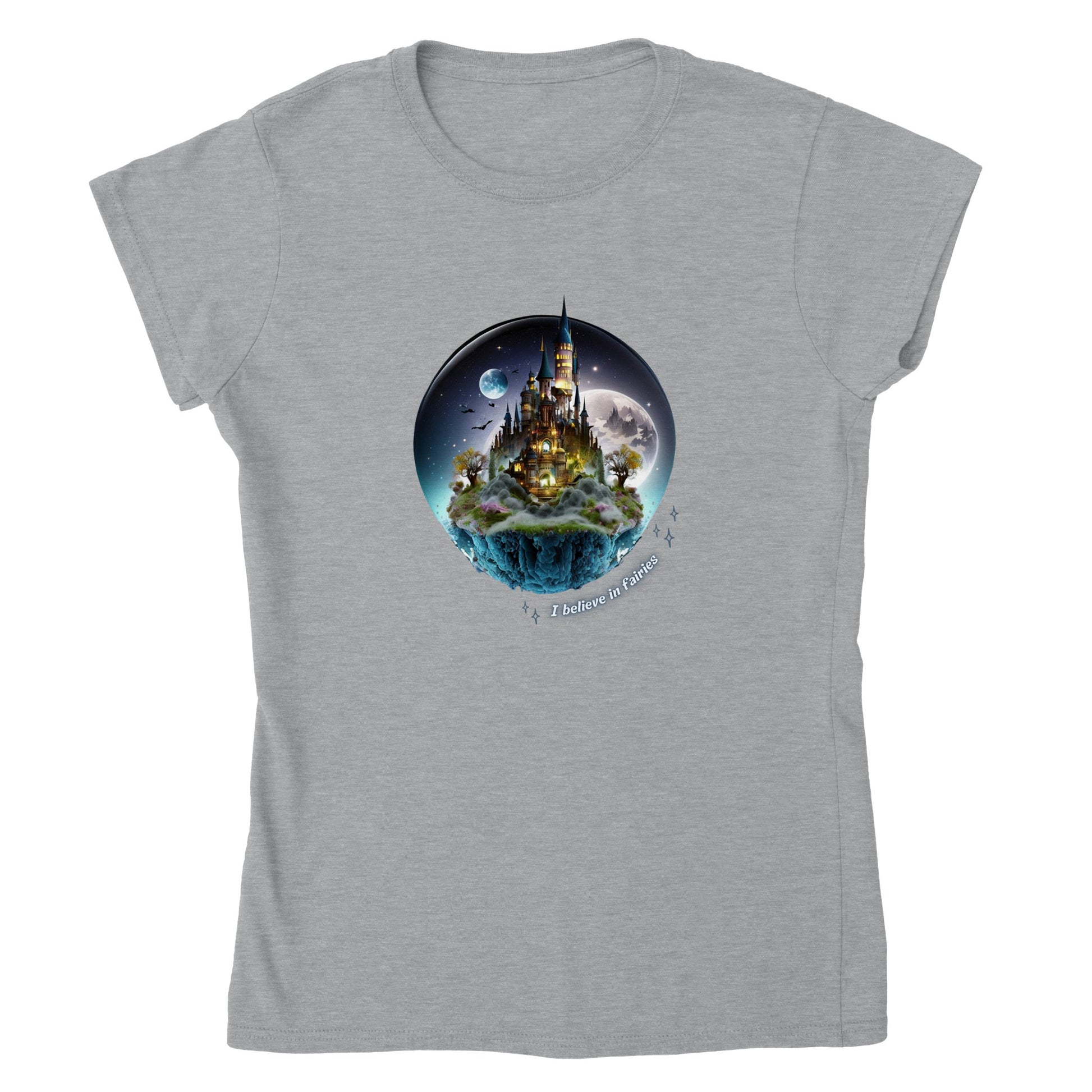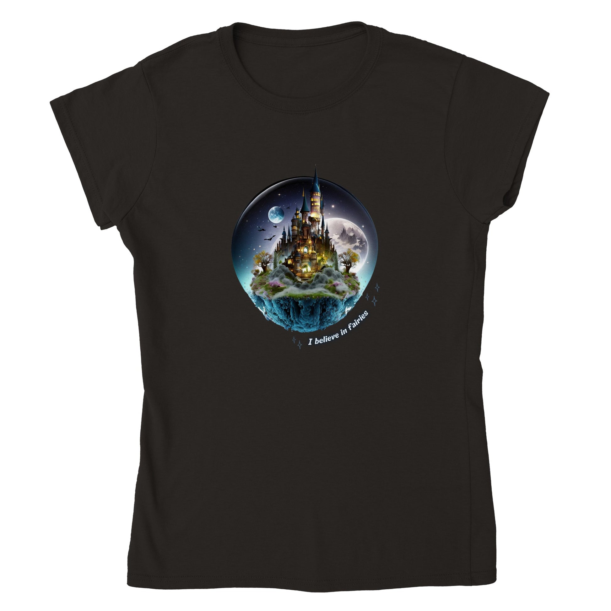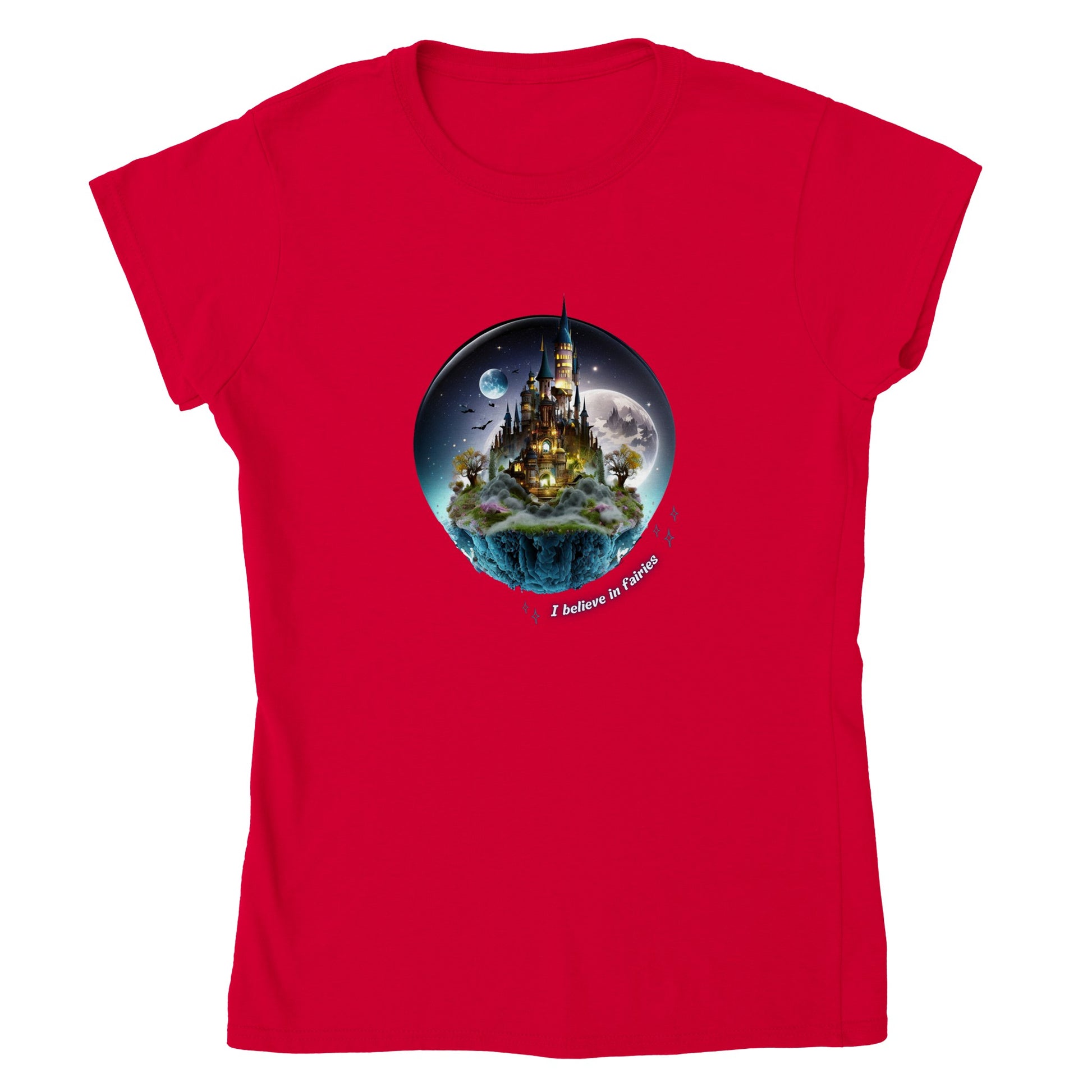 Dit t-shirt met een feëriek kasteel en de tekst 'I believe in fairies' is een must-have omdat het een vleugje magie toevoegt aan je garderobe en je verbeeldingskracht stimuleert. Het betoverende kasteel straalt positieve energie uit en herinnert je eraan om te blijven geloven in de schoonheid en wonderen van het leven.