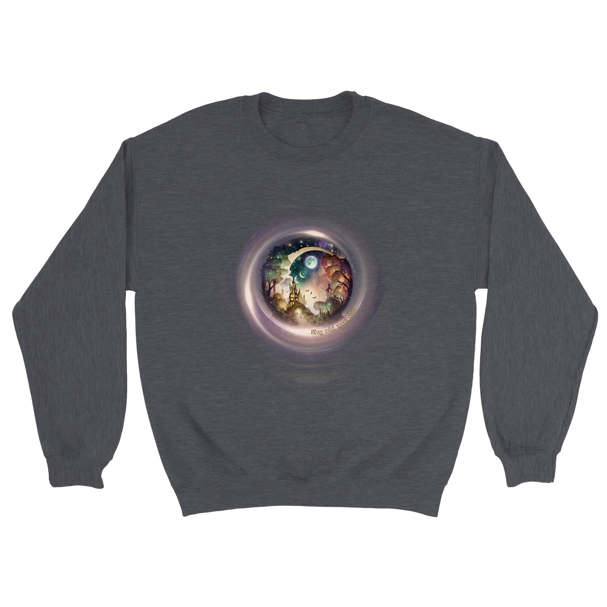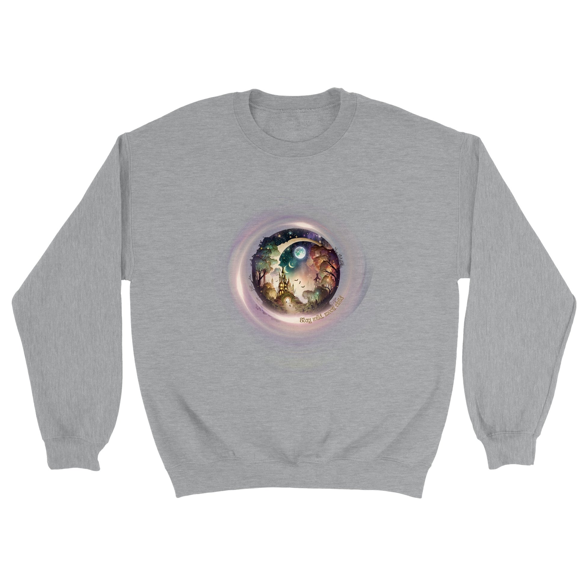 Deze sweater met een mystieke maan en de tekst 'Stay wild, moon child' is een absolute must-have voor degenen die hun vrije en avontuurlijke geest willen omarmen. Het prachtige ontwerp straalt een krachtige boodschap uit om authentiek te blijven en je innerlijke wildheid te omarmen. Met deze sweater creëer je een unieke en betoverende stijl die je persoonlijkheid en liefde voor het mystieke weerspiegelt. Laat de maan je gids zijn terwijl je de wereld trotseert en blijf trouw aan je eigen wilde natuur.